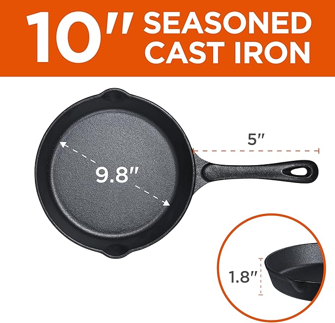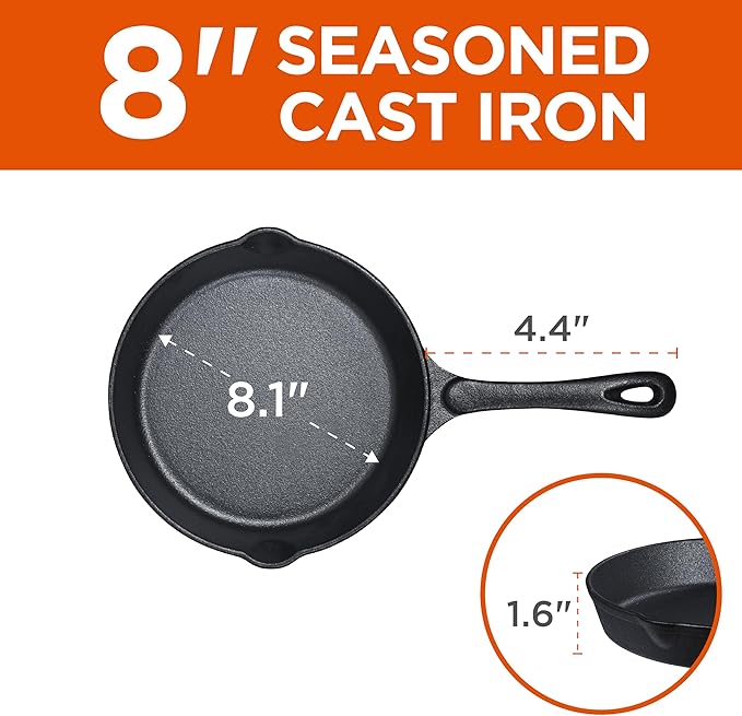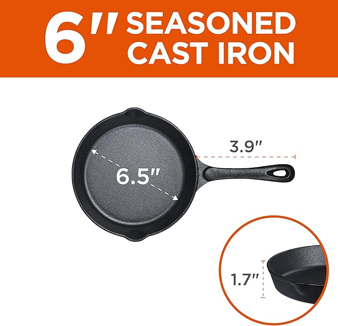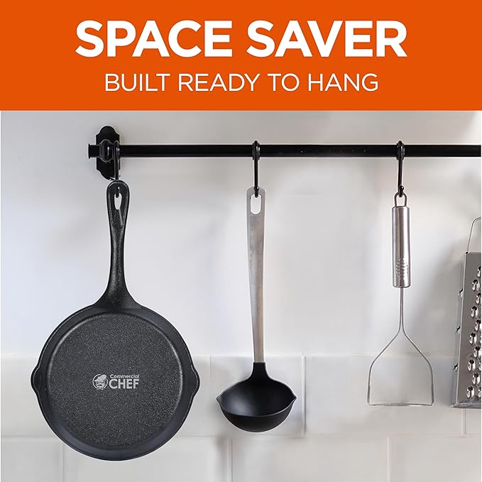 Commercial CHEF 3-Piece Cast Iron Skillet Set – 6 inch, 8 inch, and 10 inch - Pre-seasoned Cast Iron Cookware, Black