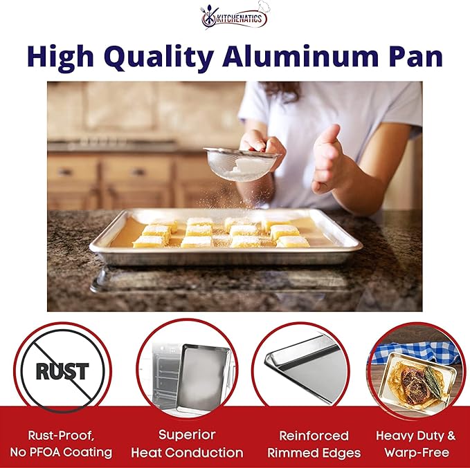 KITCHENATICS Quarter Sheet Baking Pans, Premium Quality Aluminum Cookie Sheet Set - Oven Safe, Nonstick, Rimmed Cooking Trays, 1/4 Baking Sheets for Oven, Roasting, Baking - 9.6" x 13" IN, Set of 2