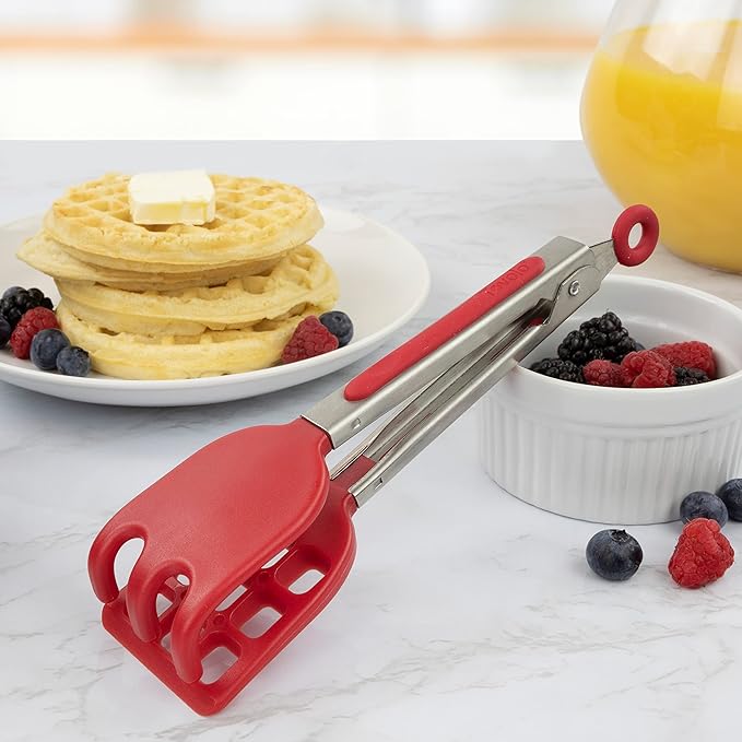 Tovolo Waffle Tongs Mini Silicone Kitchen Tongs for Cooking Serving Flat Stainless Steel Small Tongs with Silicone Tips for Salads Belgian Waffles Air Fryer Appetizers Dishwasher Safe Cayenne Red