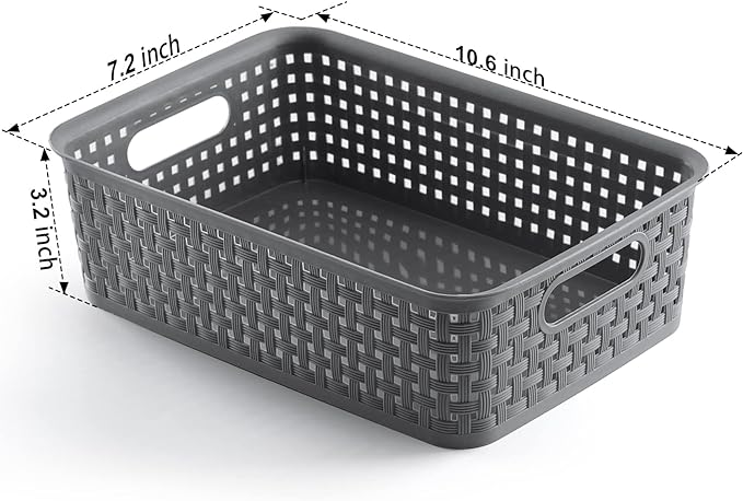 About This PRODUCT CONFIGURATION: 12 woven pattern plastic baskets, gray. Dimensions:10.6” L x 7.2” W x 3.2” H, basket use... Read more