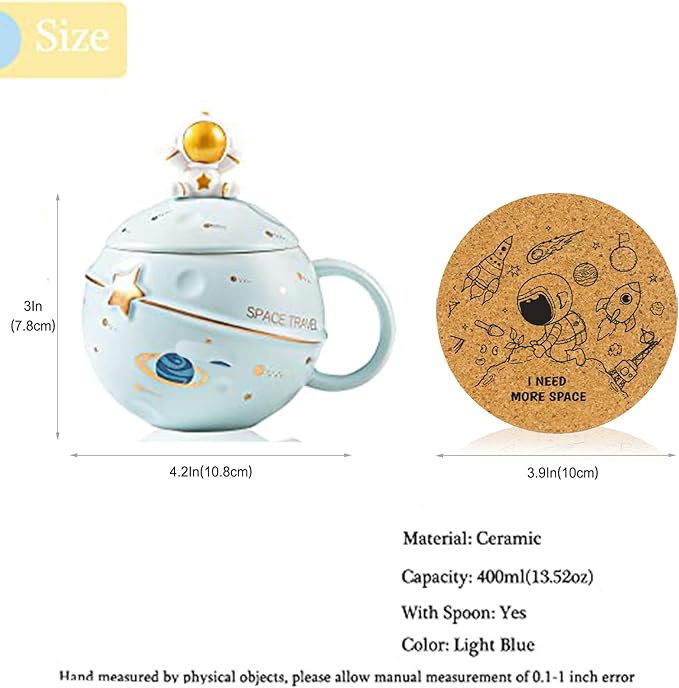Kawaii Astronaut Cup Space Embossed Planet Mug, Cute Ceramic Coffee Mug, Novelty Mug with Lid and Spoon for Coffee, Tea, Milk, Aesthetic Room Decor Funny Gift for Girl Boy Women (Blue)