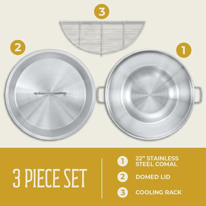 About This Concord's 3 Piece Stainless Steel 22" Comal Set contains: 22" Comal, Domed lid, and cooling rack. Thick commercial... Read more