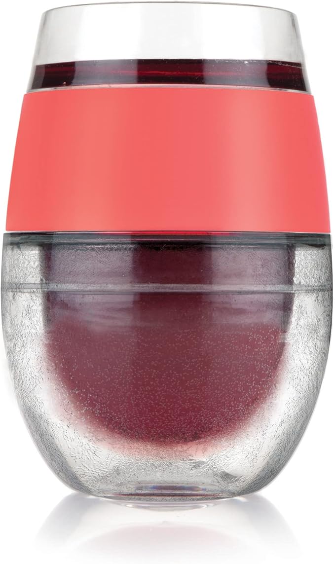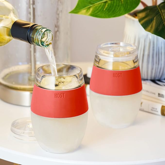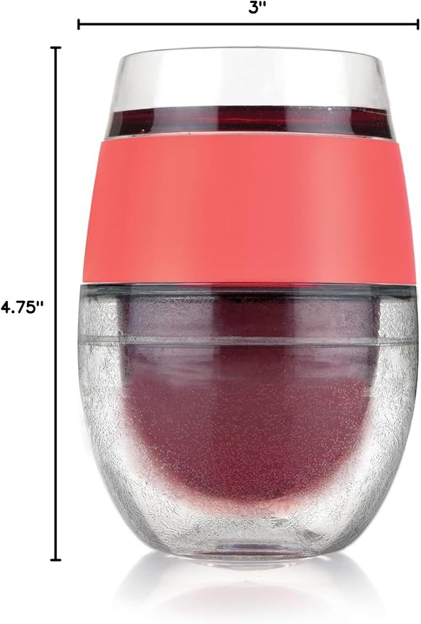 Host Cooling Wine Freeze Cup with Lid, Set of 2 Plastic Double Wall Insulated Wine Tumbler Drink Cups with Freezing Gel for Red and White Wine, Coral