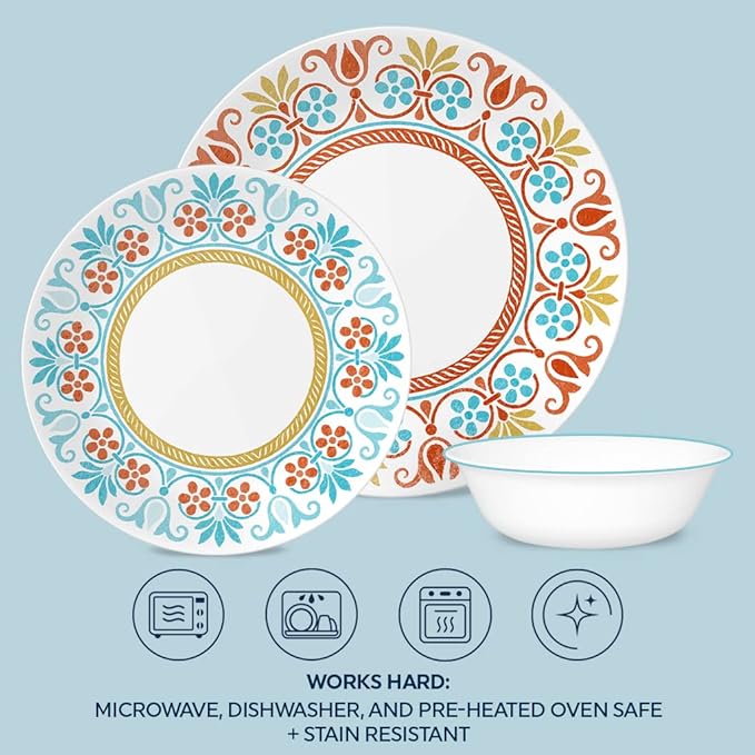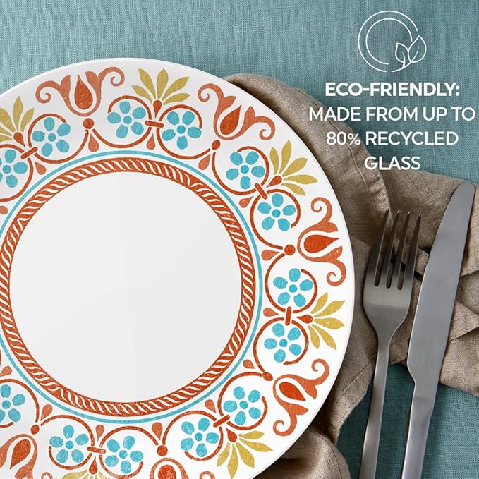 Corelle Global Collection Vitrelle 12-Piece Dinnerware Set, Triple Layer Recycled Glass, Lightweight Eco-Friendly Round Plates and Bowls Set, Terracotta Dreams