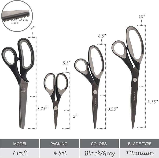 BambooMN Titanium Softgrip Scissors Set - Pinking, Sewing, Arts, Crafts, Office - 1 Set of 4 - Black w/Grey Inlays