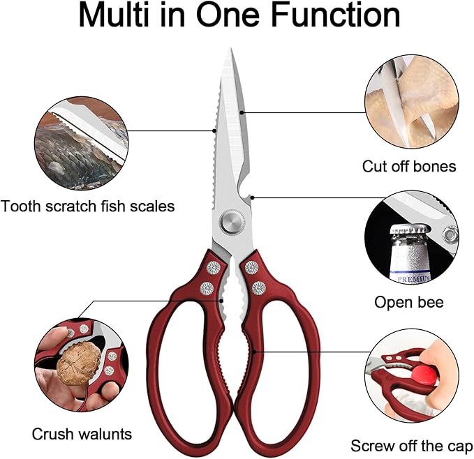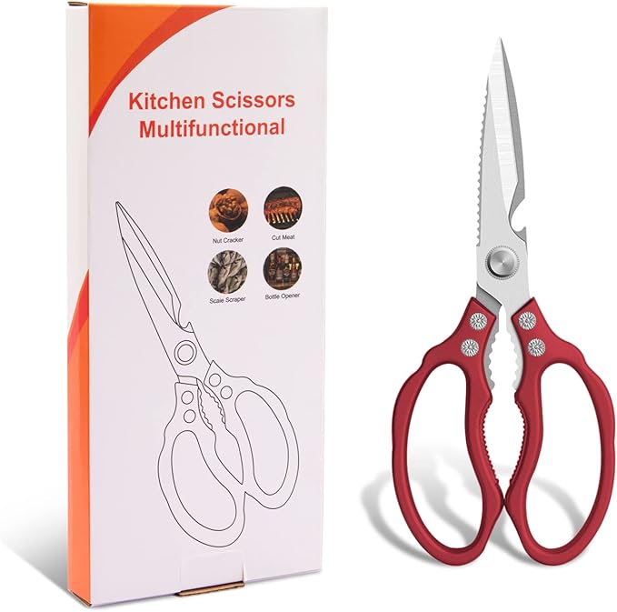 CGBE Kitchen Scissors All Purpose Heavy Duty, Ultra Sharp Stainless Steel Kitchen Shears Dishwasher Safe, Cooking Shears for Chicken, Poultry, Fish, Meat, Herbs & Grapes with Non-Slip Grips (Red)