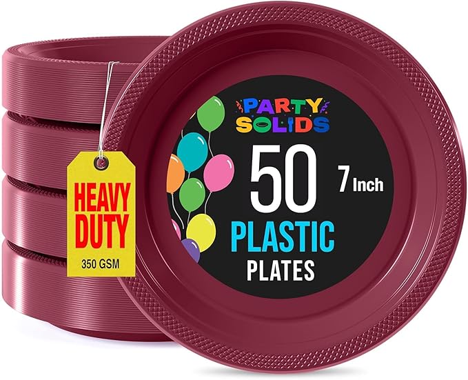 Exquisite Party Solids Burgundy Plastic Plates For Party Supplies 7" Burgundy Disposable Plates Heavy Duty 50 Pcs Plastic Dinnerware Sets Heavy Duty 350 GSM Disposable Dinnerware Set
