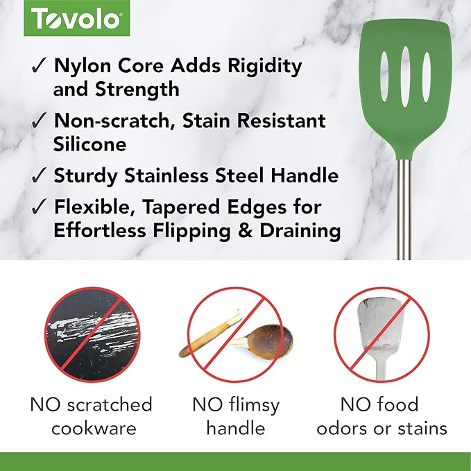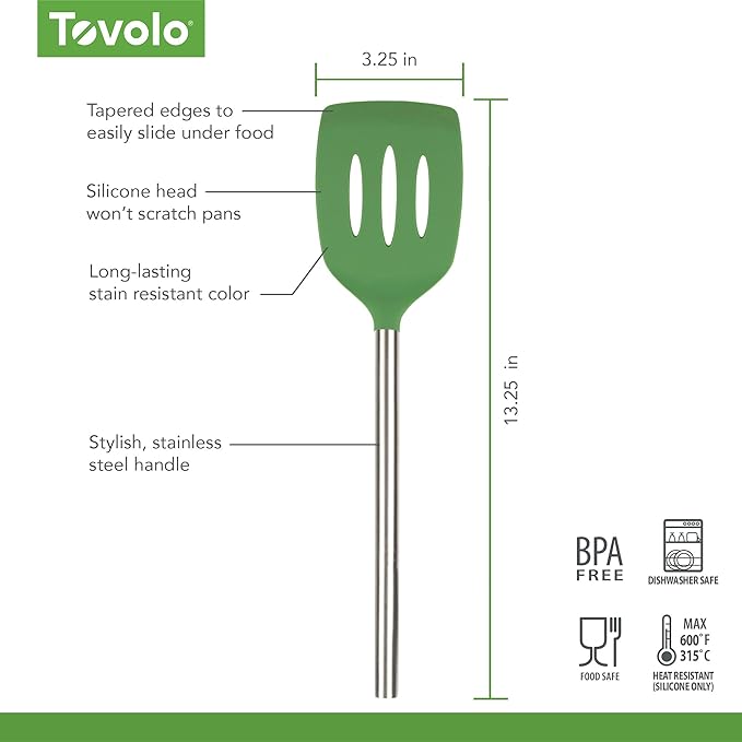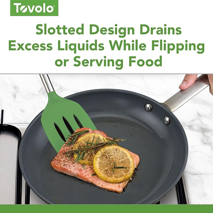 Tovolo Silicone Slotted Turner With Stainless Steel Handle, Pancake Spatula, Scratch-Resistant Kitchen Utensil for Nonstick Cookware & Cast Iron Skillets, Pesto, 1 Count