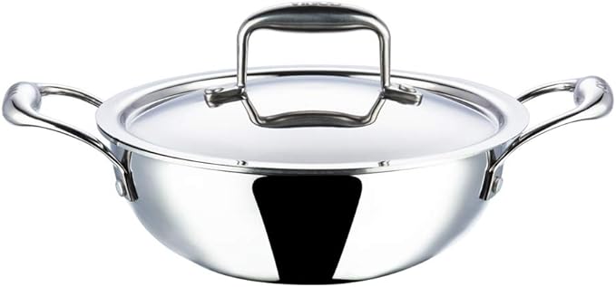 Vinod Platinum Triply Stainless Steel Kadai | Suitable For Indian Cooking, Sauces, Stews, Soups | Extra Deep Kadai With Lid | Induction, Electric Friendly (22cm)