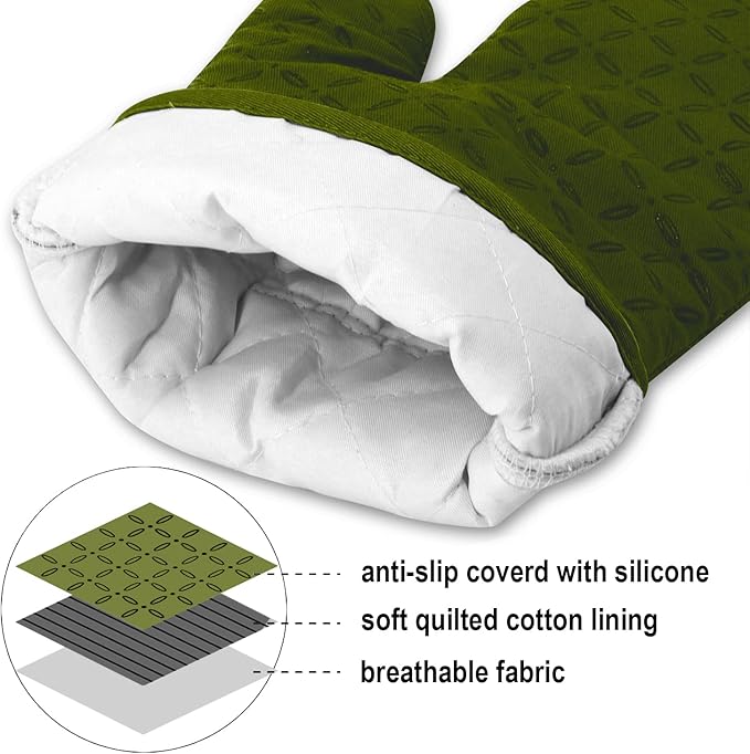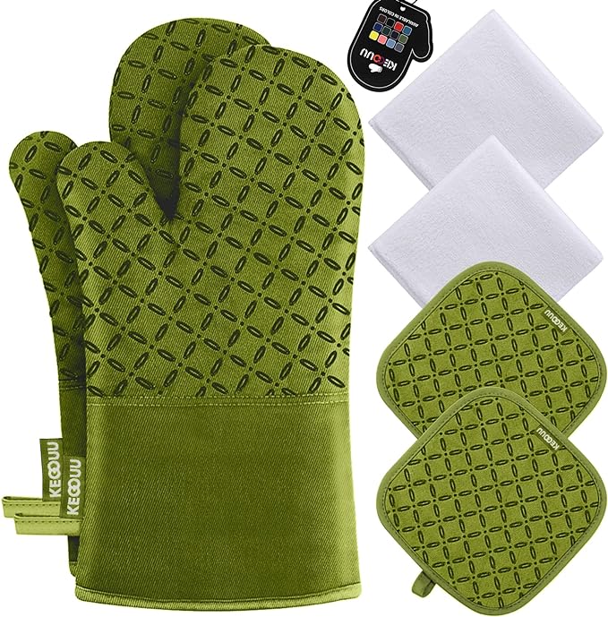 KEGOUU Oven Mitts and Pot Holders 6pcs Set, Kitchen Oven Glove High Heat Resistant 500 Degree Extra Long Oven Mitts and Potholder with Non-Slip Silicone Surface for Cooking (Olive Drab)