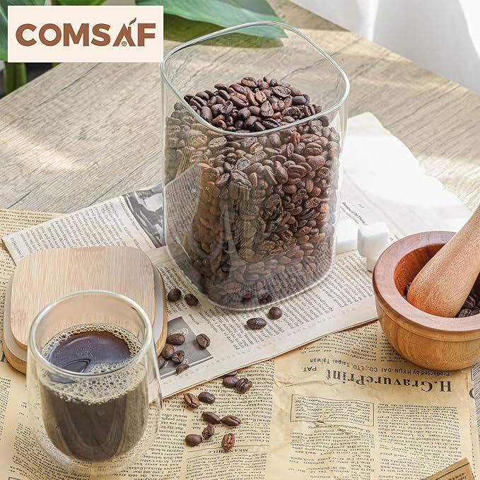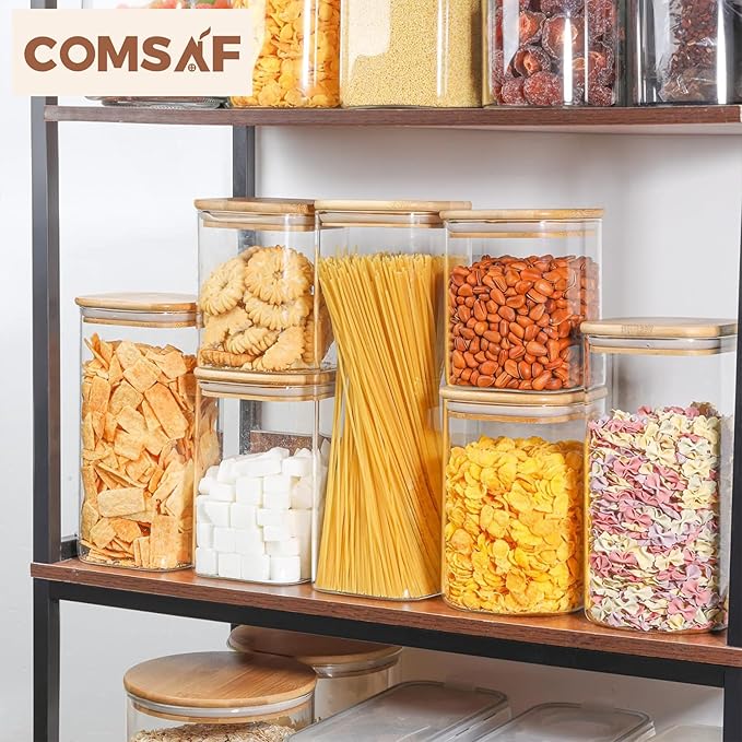 ComSaf Glass Food Storage Containers Set, 3 Pcs Airtight Clear Food Jars with Lids, Square Stackable Kitchen Canisters, Glass Jars For Spaghetti Pasta, Spice, Sugar, Candy, Tea, and Coffee Beans