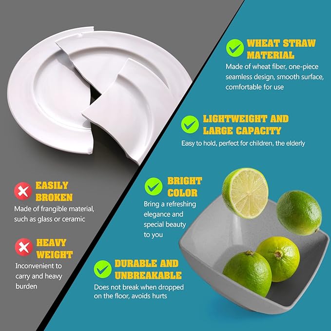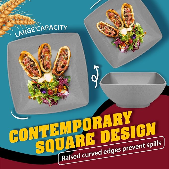 Teivio 24-piece Plastic Wheat Straw Square Dinnerware Sets,Service for 6, Unbreakable Dinner Plates, Salad Plates, Snack Bowls, Tumblers 20 oz, Dishwasher Safe, Outdoor Kitchen Dish Set, Grey