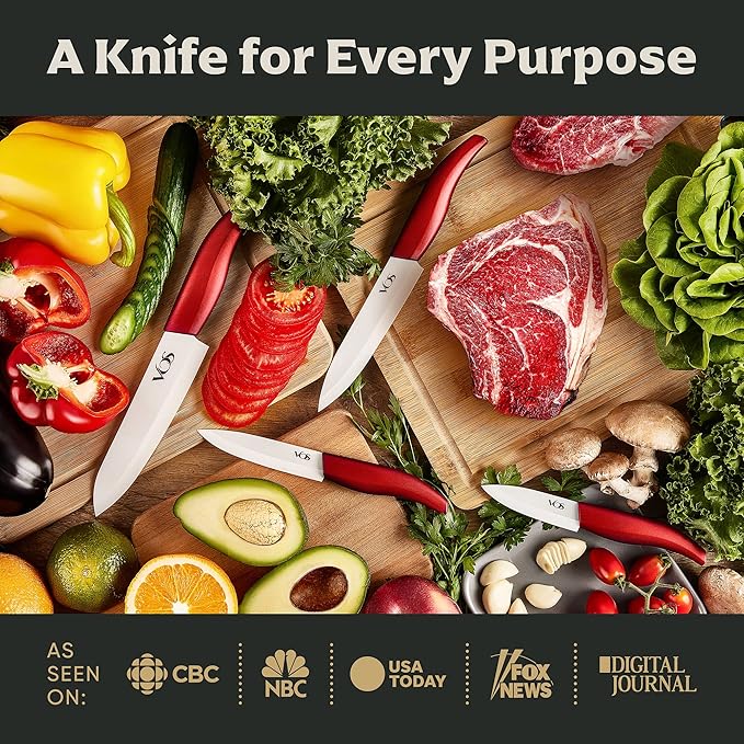 Vos Ceramic Knife Set, Ceramic Knives Set For Kitchen, Ultra Sharp Kitchen Knife Set with Covers, 3" 4" 5" 6" Paring, Santoku, Chef Knife & Utility, Lightweight, Dishwasher safe (Red with Block)