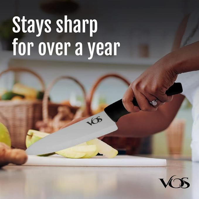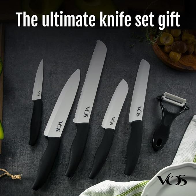 Vos Ceramic Knife with Peeler, Knives Set For Kitchen, Ultra Sharp Kitchen Knife Set with Covers, 4" 5" 6" 7" 8" Paring, Chef Knife, Santoku & 2 more, Lightweight, Dishwasher safe (Black)