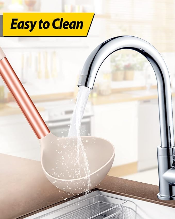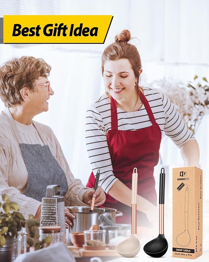 Pack of 2 Ladle Spoon,Silicone Large Spoon for Soup,Non Stick Kitchen Utensils with High Heat Resistant,BPA Free Perfect Kitchen Tools for Cooking, Stirring,Serving Soups (ROSE GOLD BLACK-KHAKI)