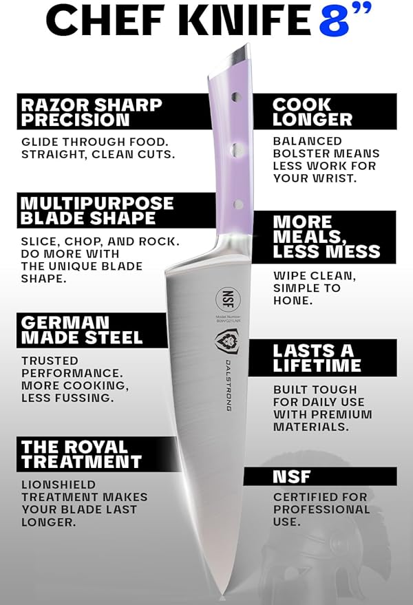 Dalstrong Chef Knife - 8 inch Blade - Gladiator Series - Forged High Carbon German Steel - Razor Sharp Kitchen Knife - Professional Full Tang Knives - Lilac Handle ABS - Sheath - NSF Certified