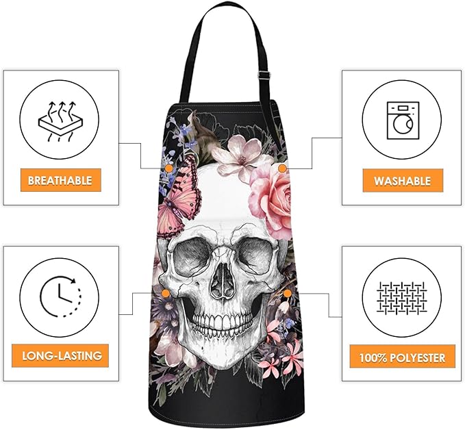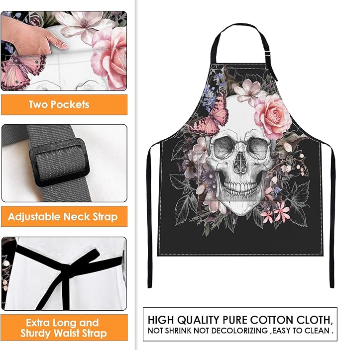 Britimes Apron Home Kitchen Cooking Baking Gardening for Women Men with Pockets Skull Flowers Vintage Rose Floral 32x28 inch