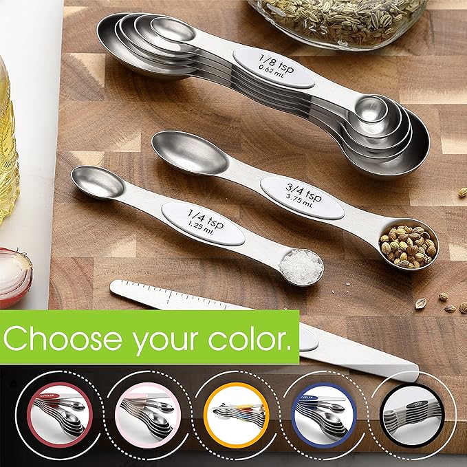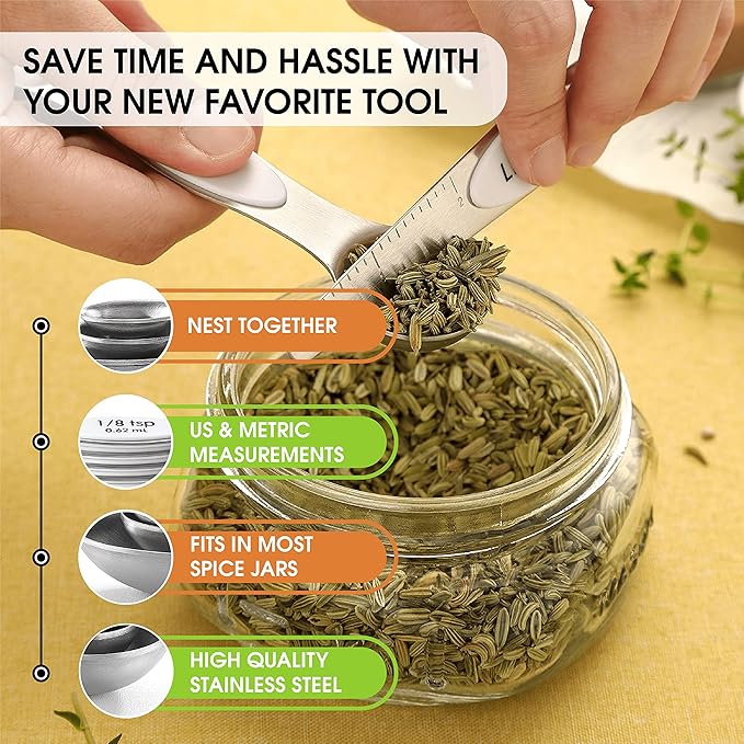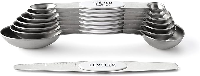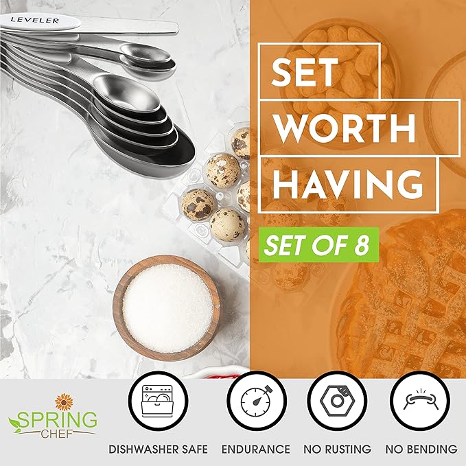 Spring Chef White Stainless Steel Magnetic Measuring Spoons Set of 8 with Leveler, Dual Sided Metal Teaspoon & Tablespoon Measuring Spoons, Fits in Spice Jars, Kitchen Gadgets for Baking & Cooking