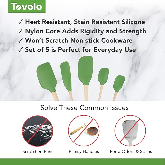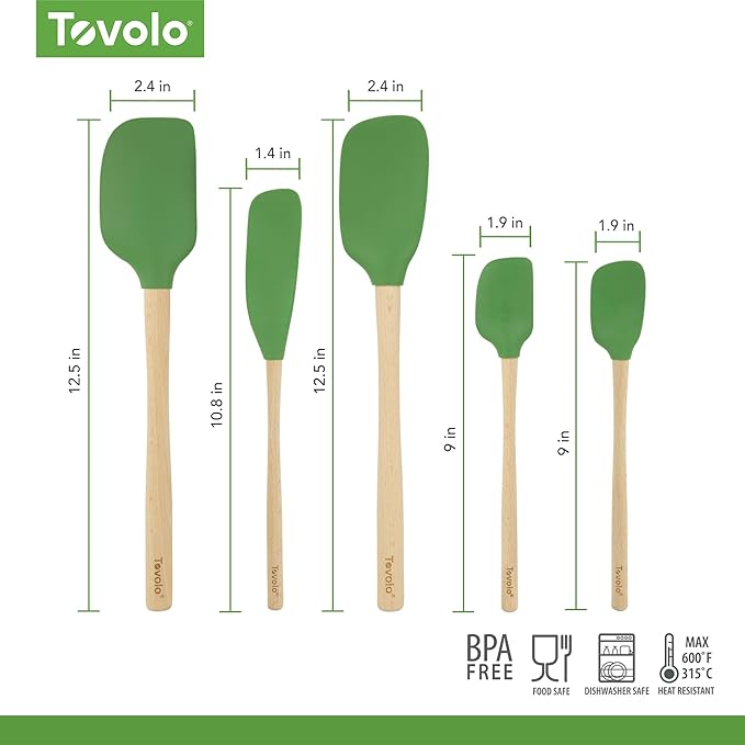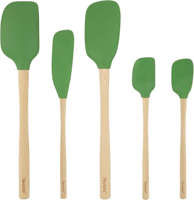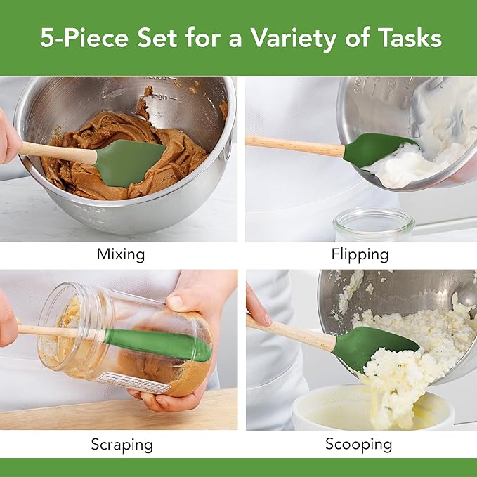 Tovolo Silicone Spatula with Wooden Handle Set of 5 Piece Silicone Kitchen Utensil Set Spoonula Jar Scraper Mini Spatula and Spoonula for Cooking Baking Mixing Folding Pesto Green