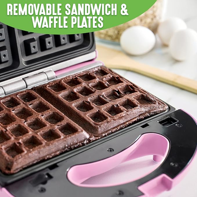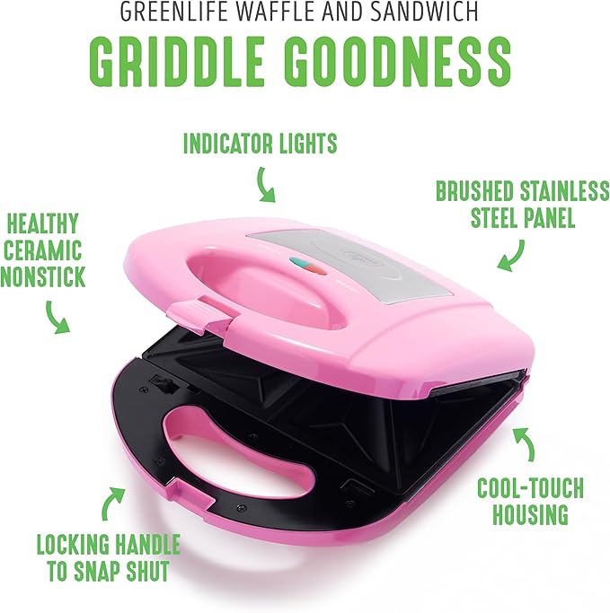 GreenLife Electric Waffle Sandwich Maker, Toaster, Panini Press with Healthy Ceramic Nonstick Plates, Perfect for Tuna Melts, Crispy Rice, Grilled Cheese, LED Indicator Light, PFAS-Free, Pink