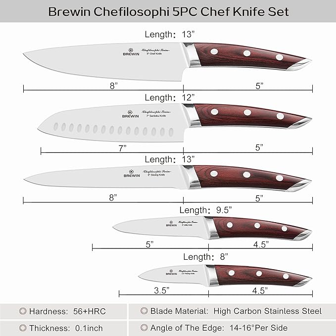 Brewin CHEFILOSOPHI Japanese Chef Knife Set 5 PCS with Elegant Red Pakkawood Handle Ergonomic Design,Professional Ultra Sharp Kitchen Knives for Cooking High Carbon Stainless Steel