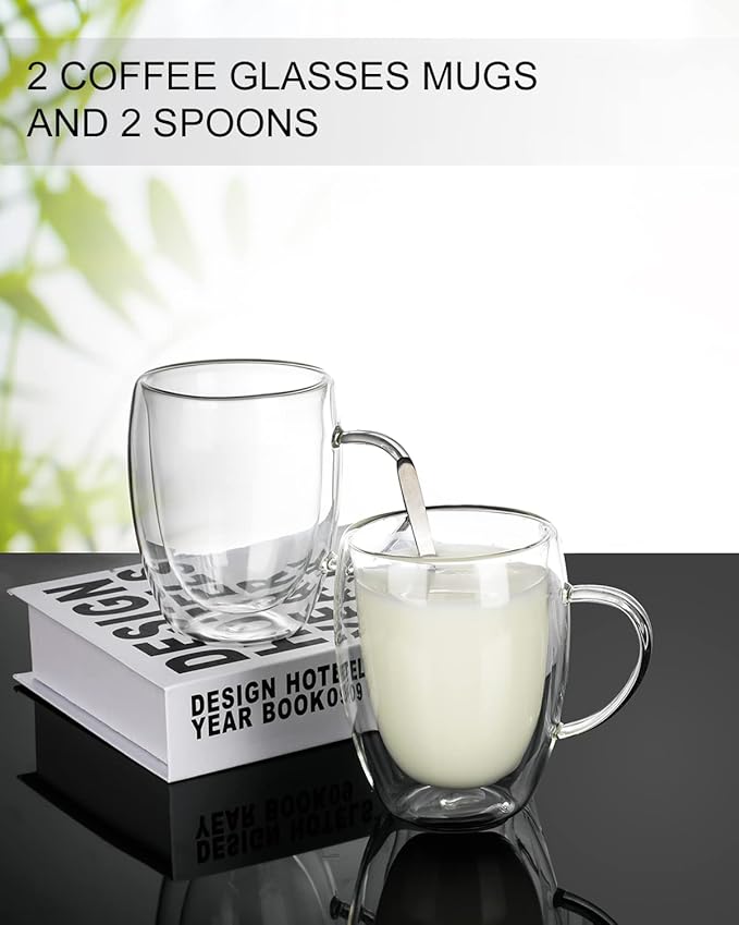 LIBWYS 2 Pack Double Walled Coffee Cups Glasses Mugs, 12oz Espresso Cappuccino Latte Tea Cups with Handle, Heat Resistant Borosilicate Clear Glasses 350ml