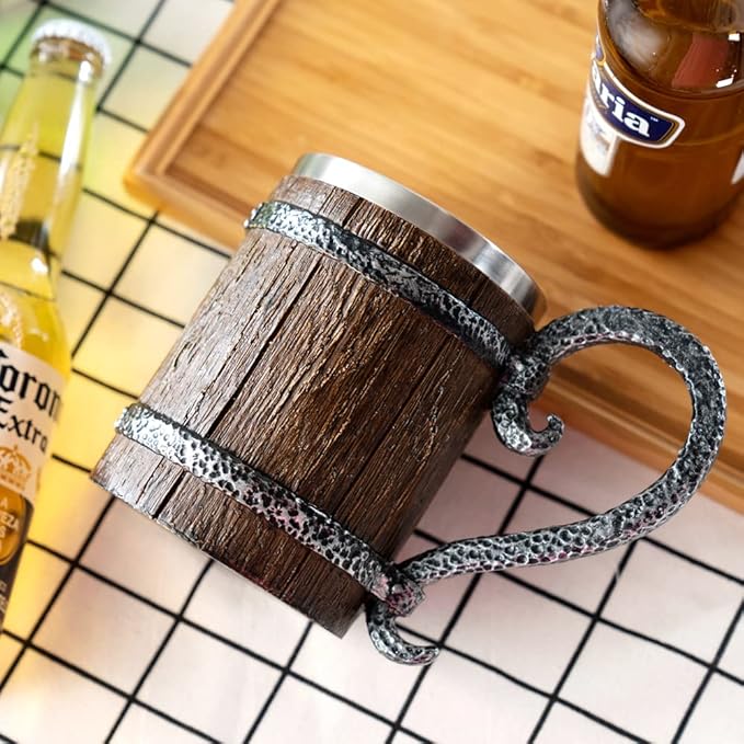 Arola Handmade Wooden Barrel Beer Mug, Stainless Steel Vintage Beer Cup, Medieval Drinkware Mug for Coffee/Beverage/Juice17oz Gift for Men.