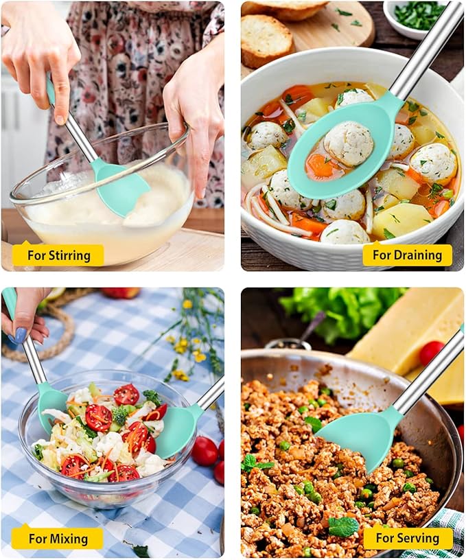 Pack of 2 Large Silicone Cooking Spoons,Non Stick Solid Basting Spoon,Heat-Resistant Kitchen Utensils for Mixing,Serving,Draining,Stirring (GREEN)
