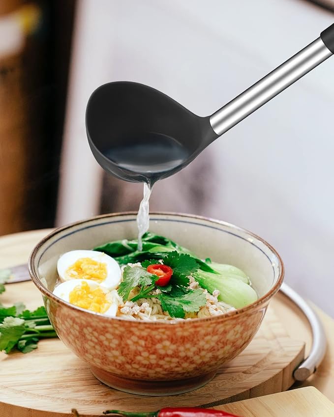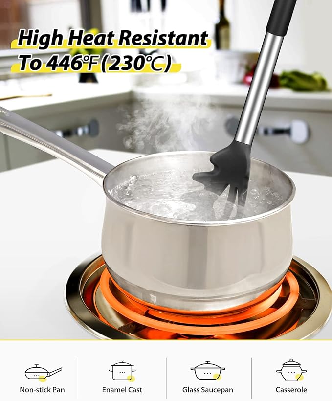 Silicone Pasta Fork and Soup Ladle Set, Non-Stick BPA Free Heat-Resistant Handy Kitchen Utensils for Cooking, Serving, Draining, Stirring (Black)
