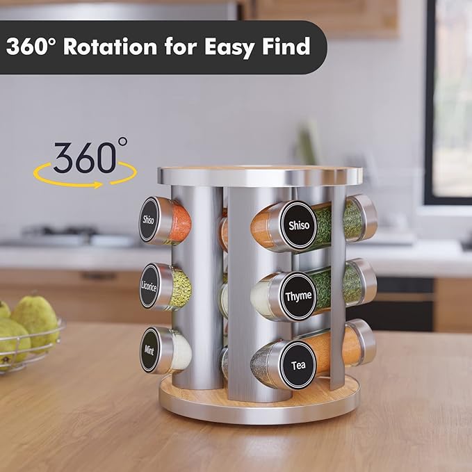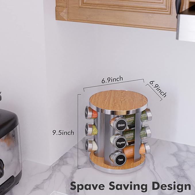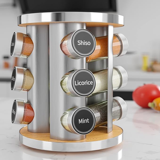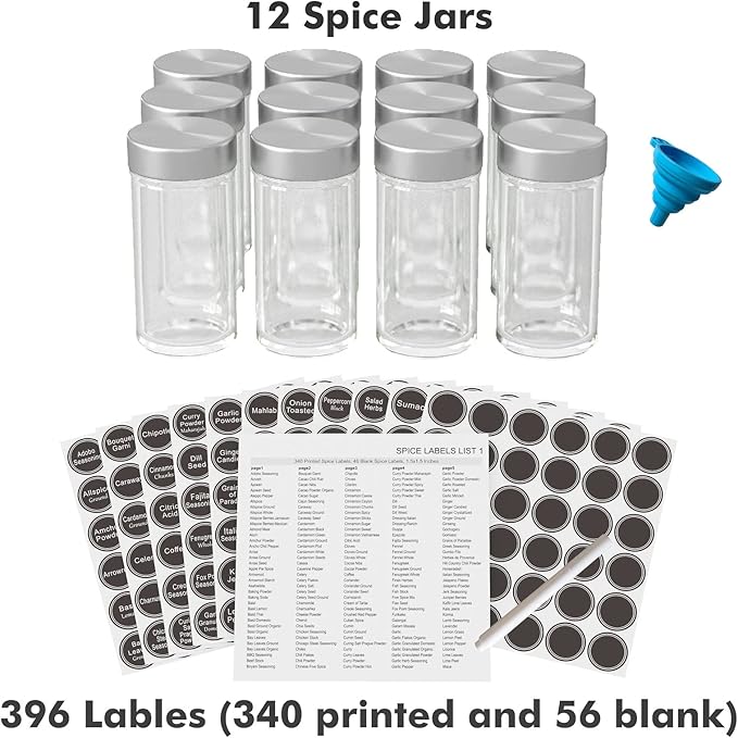 New England Stories Revolving Spice Rack Set with 12 Spice Jars, Kitchen Spice Tower Organizer for Countertop or Cabinet - Carousel Storage Includes 386 Spice Labels