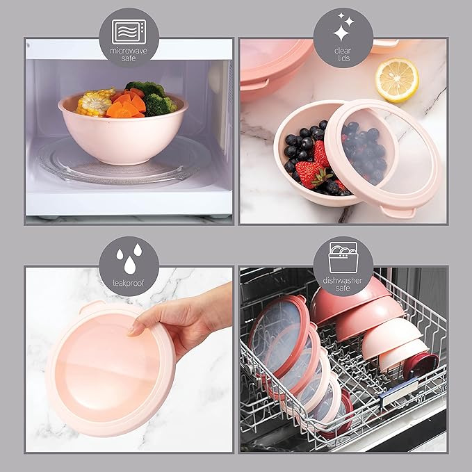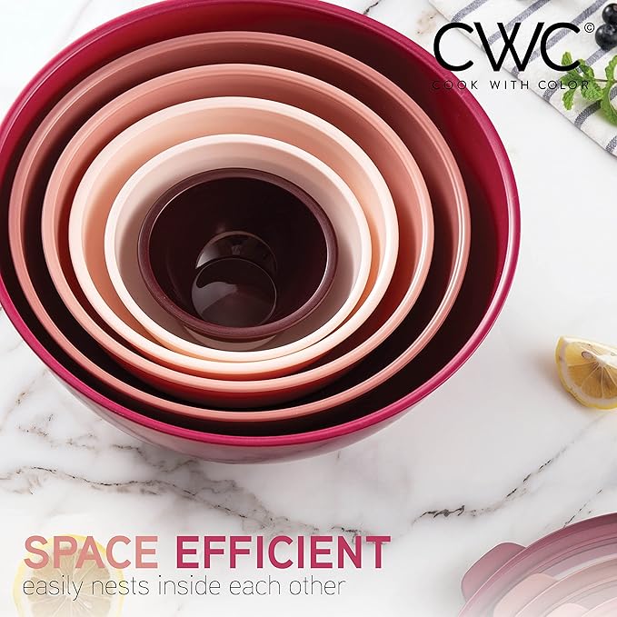 COOK WITH COLOR Mixing Bowls with TPR Lids - 12 Piece Plastic Nesting Bowls Set includes 6 Prep Bowls and 6 Lids, Microwave Safe (Rose)