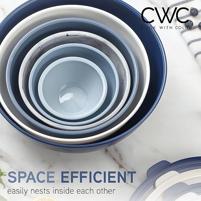 COOK WITH COLOR Mixing Bowls with TPR Lids - 12 Piece Plastic Nesting Bowls Set includes 6 Prep Bowls and 6 Lids, Microwave Safe Mixing Bowl Set (Blue and White)