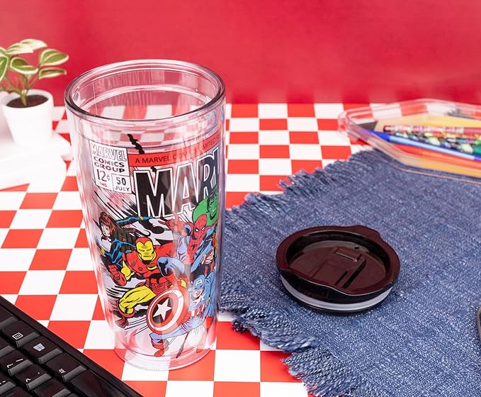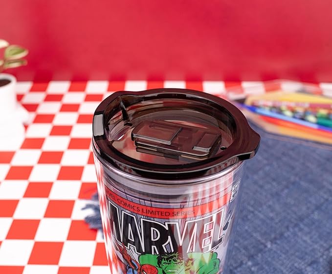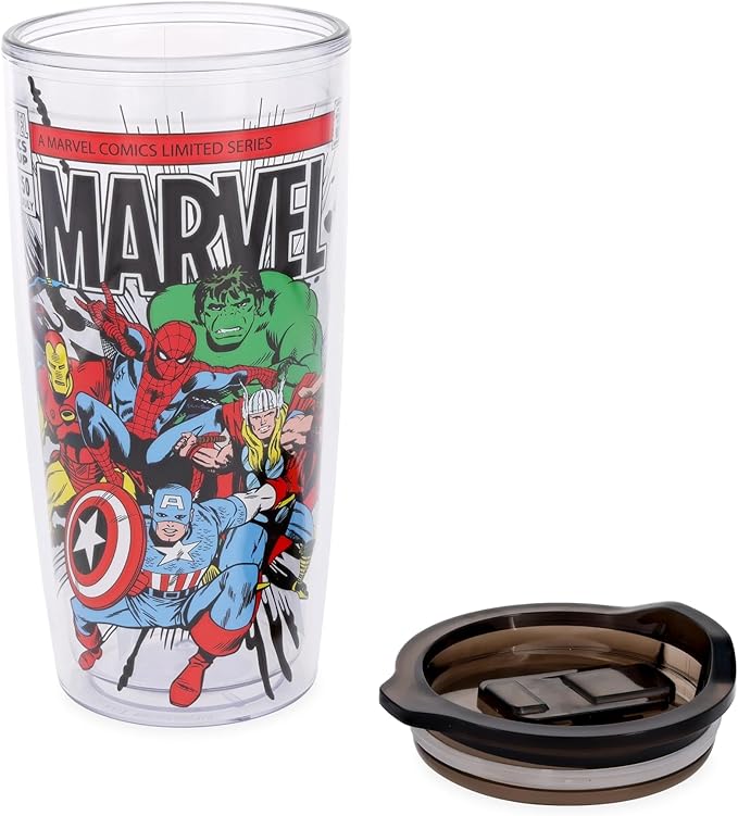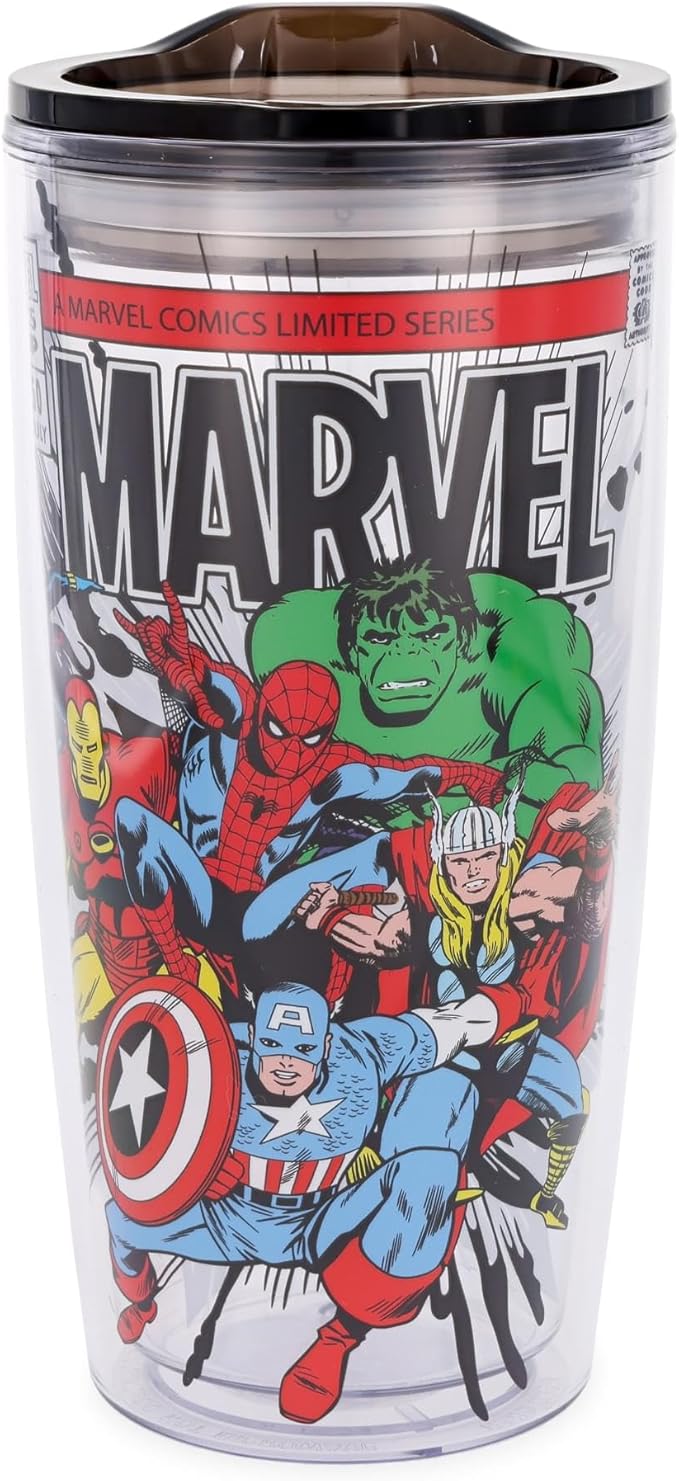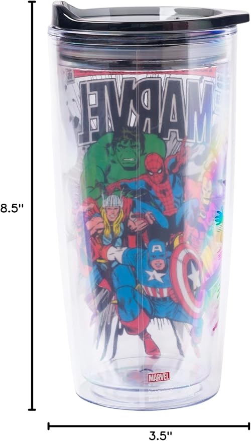 Silver Buffalo Marvel Avengers Featuring Spider-Man, Captain America, Thor, Hulk, and Iron Man Double Wall Travel Tumbler with Slide Close Lid, 20 Ounces