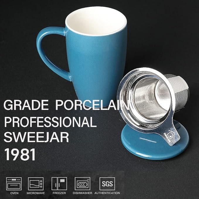 Sweejar Porcelain Tea Infuser Mug with Lid, 16 oz Teacup with Strainers for Loose Leaf Tea, Microwave and Dishwasher Safe Coffee Mug(Fog blue)