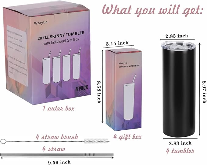 4 Pack 20 Oz Straight Skinny Tumblers,Individually Gift Boxed Stainless Steel Slim Skinny Tumbler Set Bulk, 20 Oz Insulated Slim Thin Travel Tumbler Cup for Diy, Black