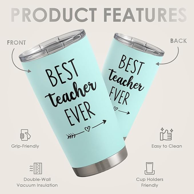 SANDJEST Teacher Tumbler - Best Teacher Ever Travel Coffee Mug Appreciation Gift for Teachers - 20oz Stainless Steel Tumblers Awesome Gifts for Birthday, Christmas, Graduation Day, Back To School