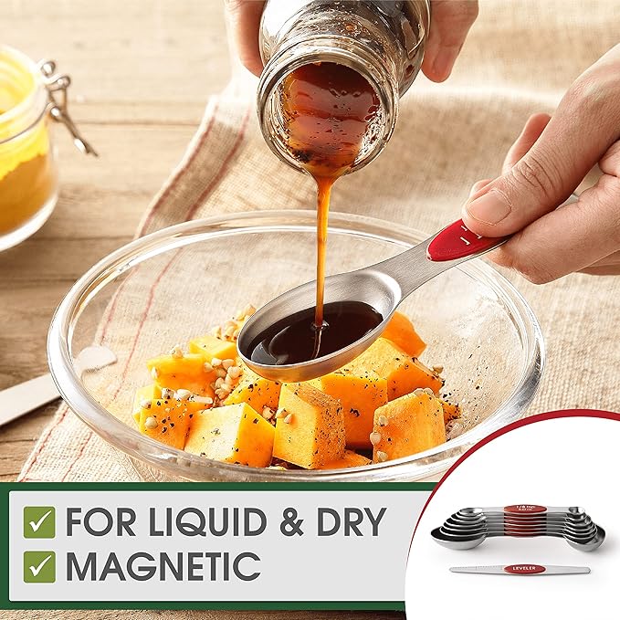 Spring Chef Red Stainless Steel Magnetic Measuring Spoons Set of 8 with Leveler, Metal Teaspoon & Tablespoon Measuring Spoons with Strong Magnets, Kitchen Gadgets for Baking & Cooking - Set of 2