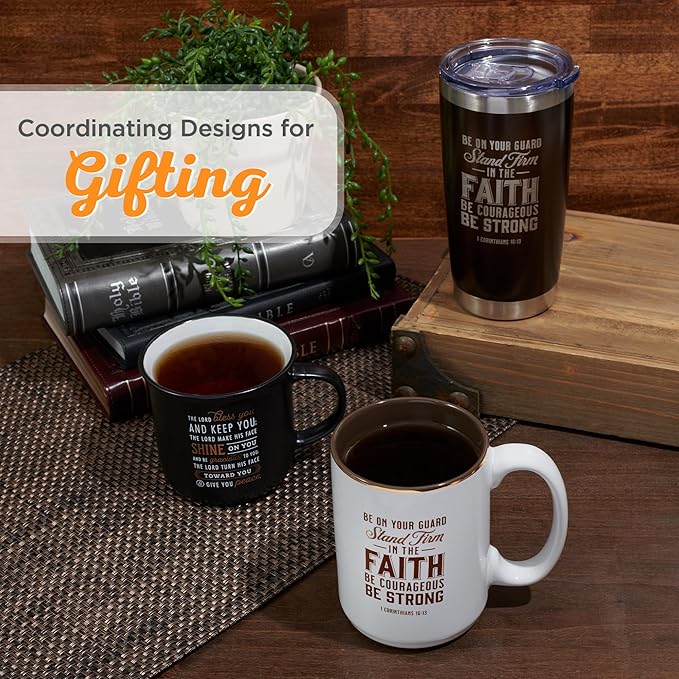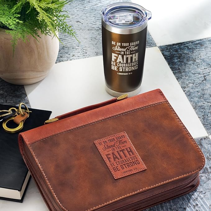 Christian Art Gifts Stainless Steel Double Wall Vacuum Insulated Tumbler 18 oz Brown Travel Mug with Retractable Lid for Women & Men Inspirational Bible Verse - Stand Firm -1 Corinthians 16:13