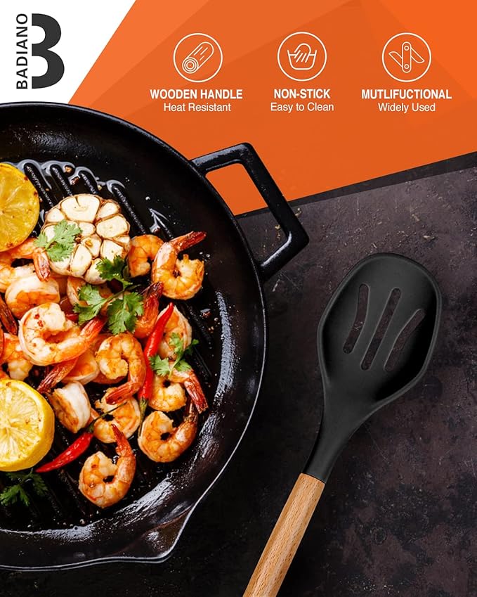 Large Silicone Cooking Spoons, 2 Pack Nonstick Solid and Slotted Wooden handle Spoon Set, Heat Resistan Silicone Kitchen Spoons for Cooking, Serving, Basting, Mixing (Black)