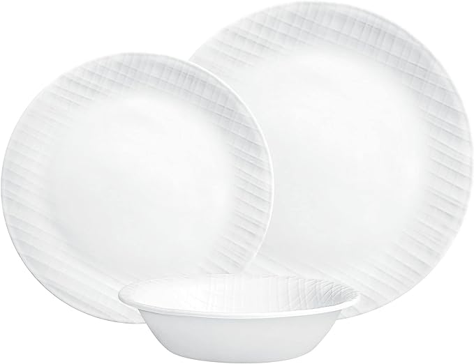 Corelle Dinnerware Set, 12-Piece, Linen Weave, Tempered Glass, Dinner Plates, Side Plates & Bowls, 3X More Durable, Half The Space & Weight of Ceramic, 1146908