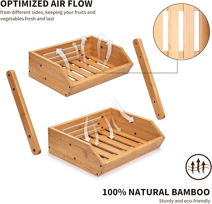 2 Tier Fruit Basket For Kitchen- Bamboo Fruit and Vegetable Storage Bowl Stand For Kitchen Countertop, , Produce Basket Fruit Holder for Potato, Onion, Bread, Snack Storage