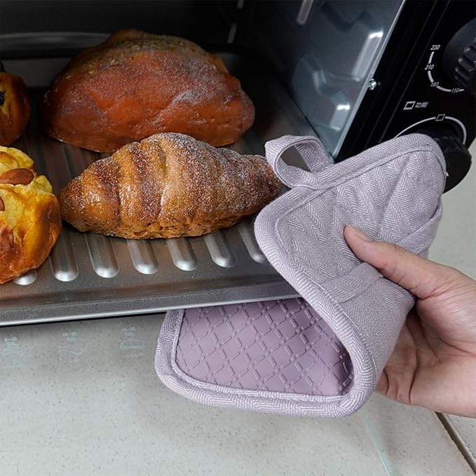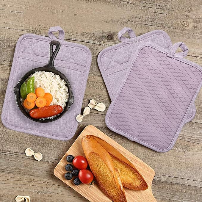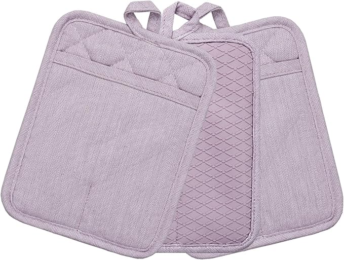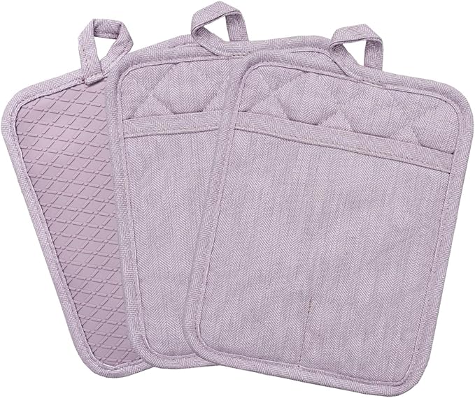 Pot Holders Yarn-Dyed Set of 3 Non Slip Silicone Kitchen Lines Heat Resistant 500℉ Kitchen Gloves BBQ Cooking Baking Cooking Barbecue Microwave Machine Washable (Purple Pot Holders)