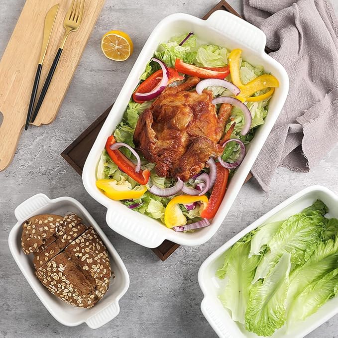 Sweejar Baking Pans Set, Ceramic 9x13 Baking Dish with Handle, Rectangular Casserole Dishes for Oven, Bakeware Sets of 3, Durable Lasagna Pan Deep for Kitchen, Banquet, Wedding Gift(White)