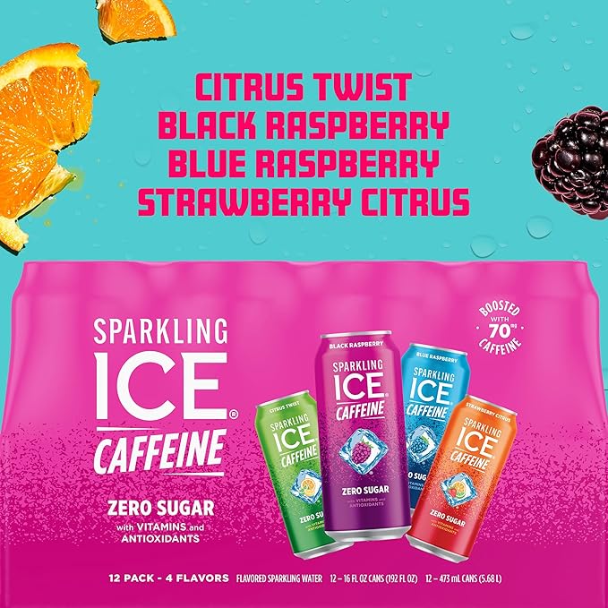 Sparkling Ice Caffeine Variety Pack, Flavored Sparkling Water, Zero Sugar, with Vitamins and Antioxidants, 16 fl oz, 12 count (Citrus Twist, Black Raspberry, Blue Raspberry, Strawberry Citrus)