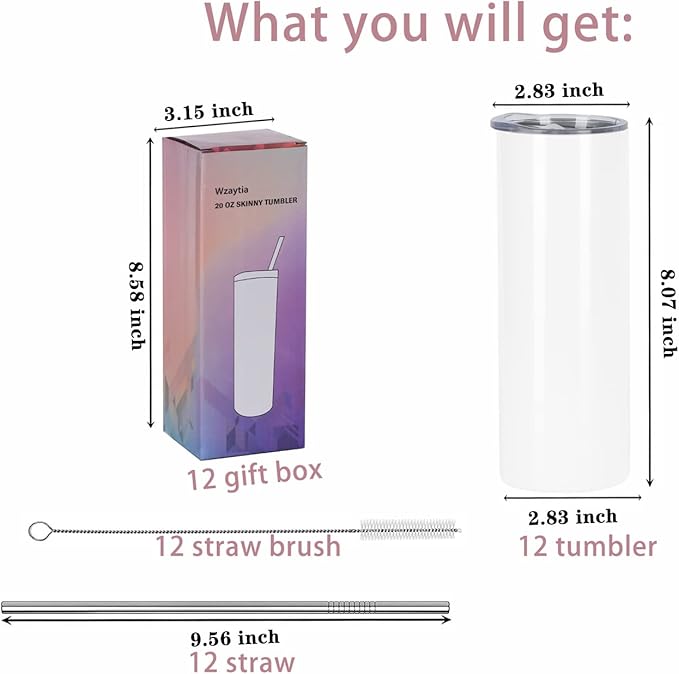 12 Pack 20 Oz Straight Skinny Tumblers,Individually Gift Boxed Stainless Steel Slim Skinny Tumbler Set Bulk, 20 Oz Insulated Slim Thin Travel Tumbler Cup for Diy, White