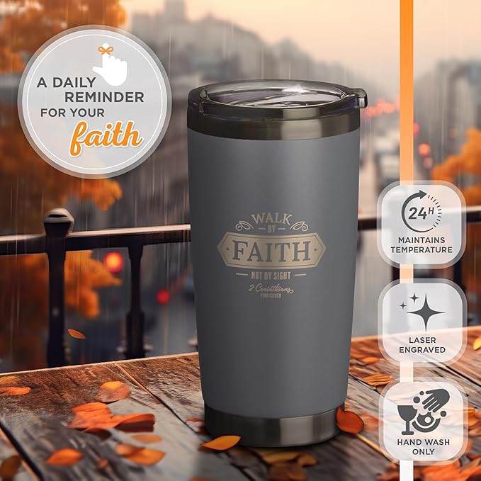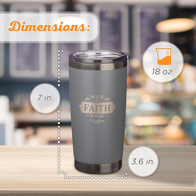 Christian Art Gifts Stainless Steel Double Wall Vacuum Insulated Travel Mug 18 oz Gray Bible Verse Tumbler with Retractable Lid for Men & Women - Walk by Faith - 2 Corinthian 5:7