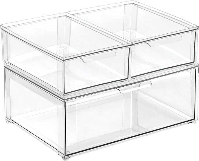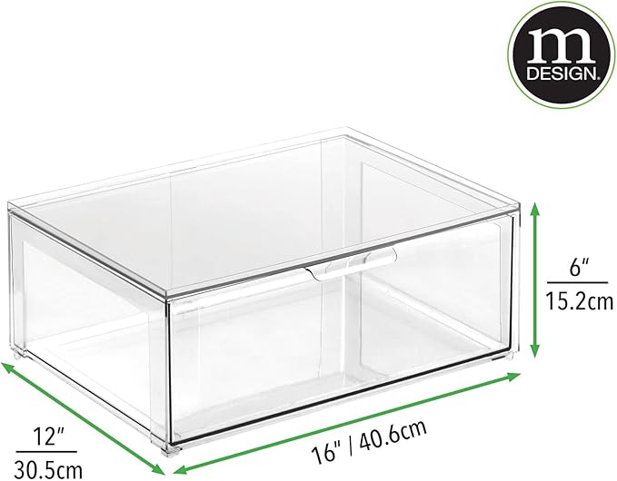 mDesign Plastic Stackable Closet Storage Organizer Bin Containers with Front Pull Drawer for Cabinet, Desk, Shelf, Cupboard, or Dresser Organization - Lumiere Collection - Set of 3 - Clear