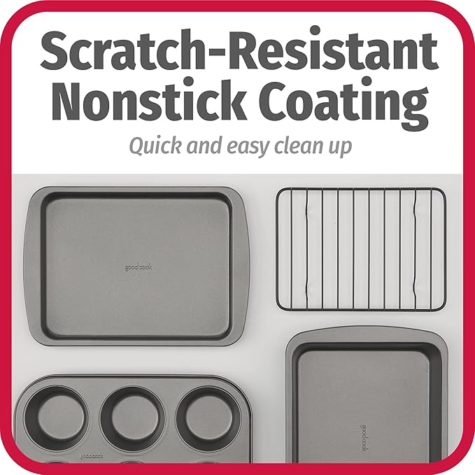 GoodCook 4-Piece Nonstick Steel Toaster Oven Set with Sheet Pan, Rack, Cake Pan, and Muffin Pan, Gray, 4-Piece Set Distributes Heat Evenly, Nonstick Coating, Dishwasher-Safe
