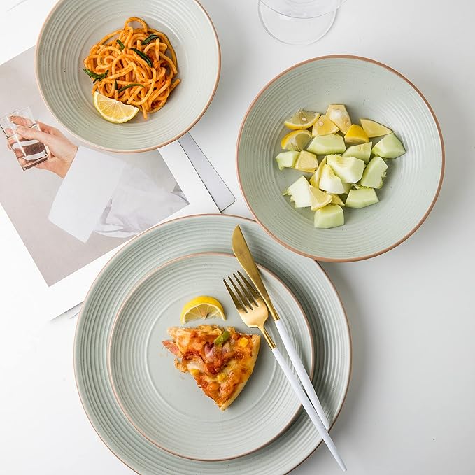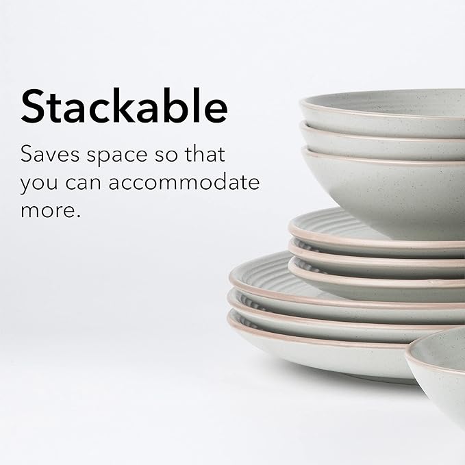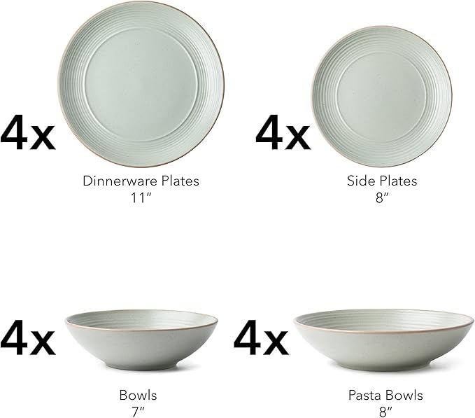 RINGAR Round Stoneware 16pc Double Bowl Dinnerware Set for 4, Dinner Plates, Side Plates, Cereal Bowls, Pasta Bowls - Speckle Matte White (405878)