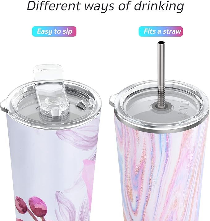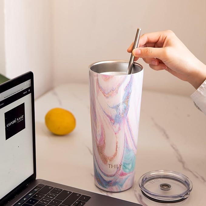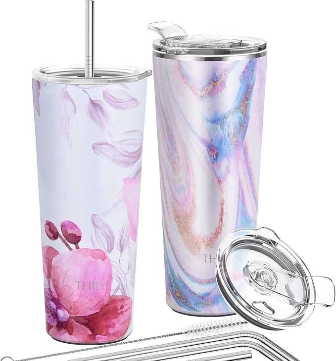 THILY Stainless Steel Vacuum Insulated Tumbler 26 oz Triple-Insulated Travel Mug with Splash-Proof Lid, for Iced Coffee and Hot Beverage, Pink Ripple + Lotus Flower